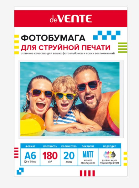 —Фотобумага для струйной печати, deVENTE, А6, 20 л, 180 г;м2, матовая, односторонняя, 2042412