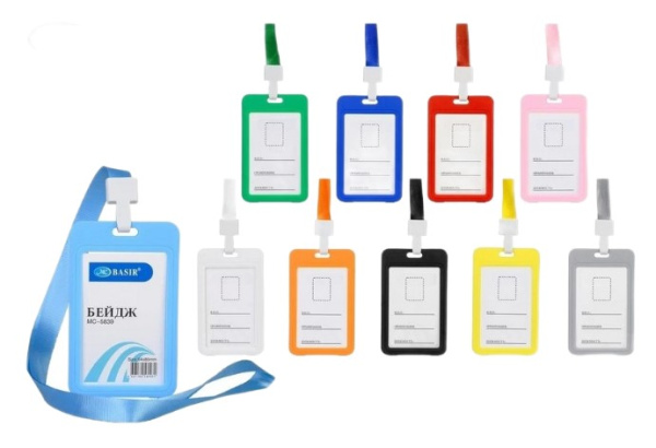 —Бейдж 'Basir' 54х85 мм на шнурке, вертикальный цветной, цвета ассорти, MC-5839