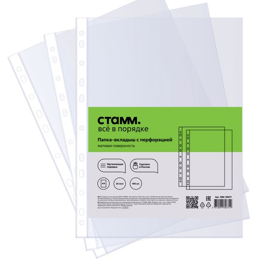 Папка-вкладыш с перфорацией (файл) СТАММ А4, 25 мкм, матовая, (100 шт;уп), ММ-30671