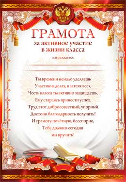 —Грамота родителям 'За активное участие в жизни класса', (20 шт;уп), 0-281