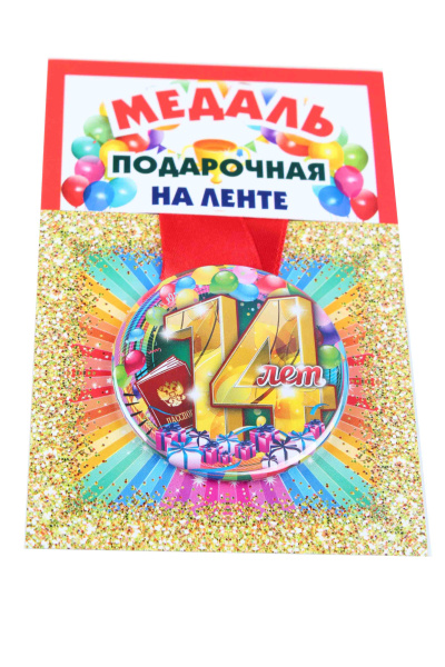 —Медали именинникам на ленте пластиковые 14 лет D=5,5 см.