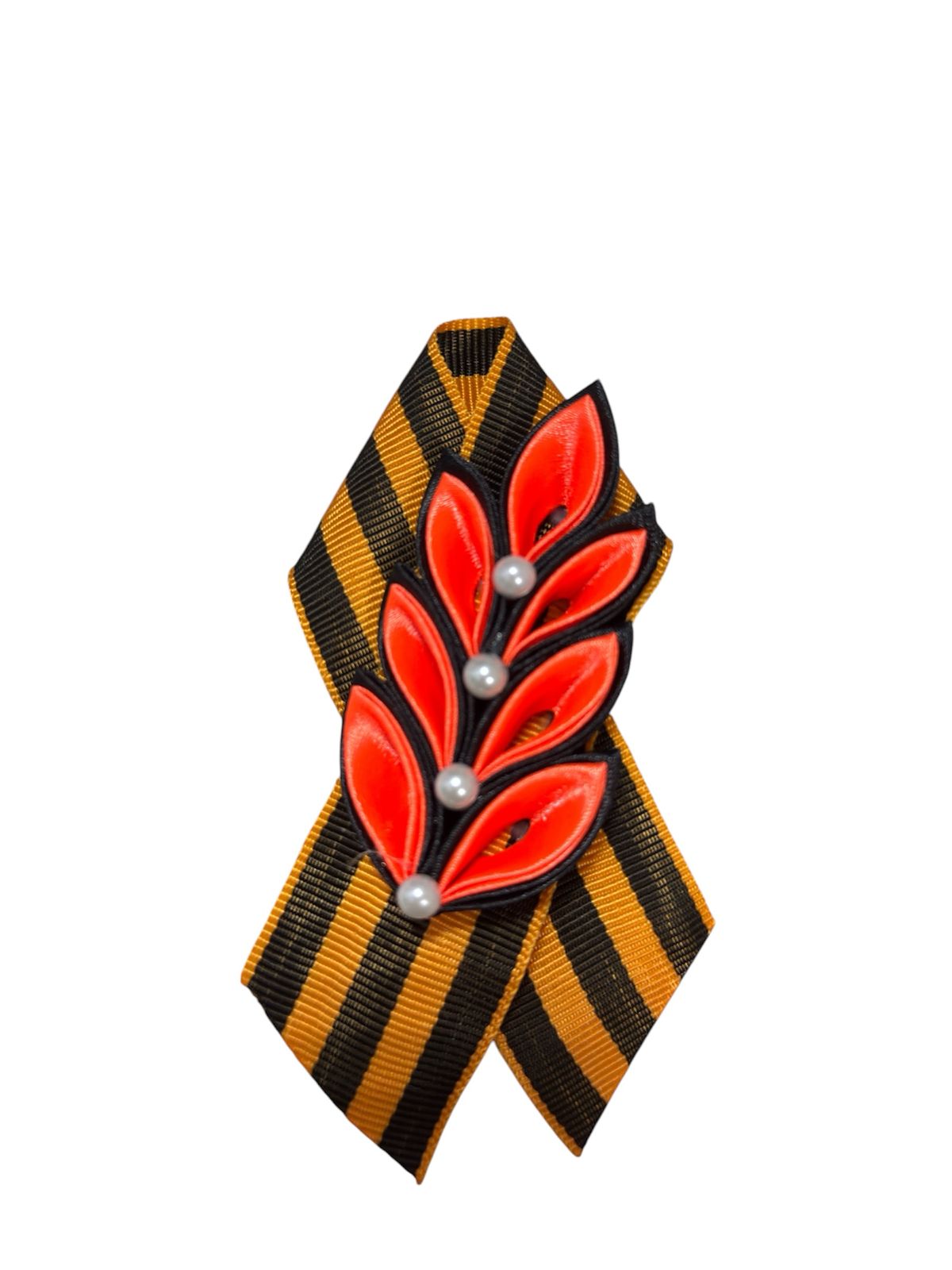—Значок Брошь-3D 'Цветок колосок георгиевский с жемчужинами' на георгиевской ленте,