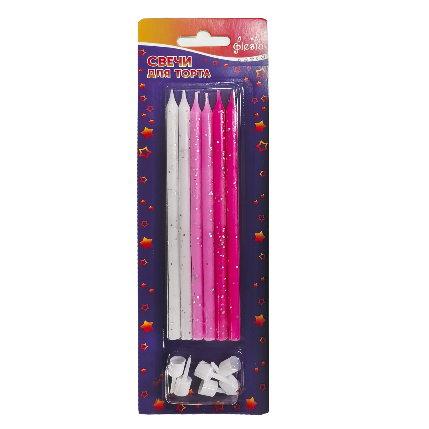 Свечи для торта 'Fiesta', розовый блеск, 14,5 см, с подставками, (6 шт;уп), PG-6-01