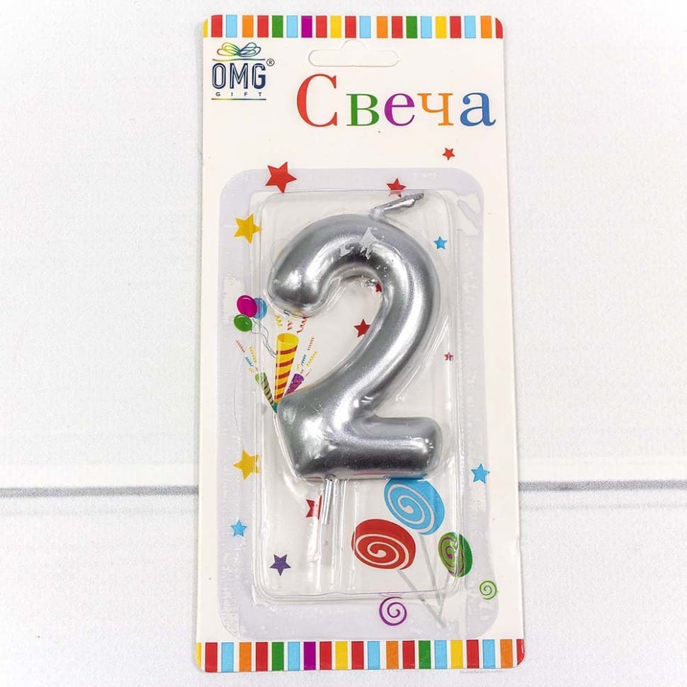 —Свеча для торта 'Цифра 2. Серебряный', OMG, 6 см, картон. уп., европодвес, ОМ-20014;2