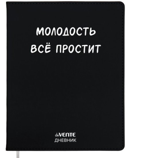 Дневник 'deVENTE. Молодость всё простит' универсальный блок, 48 листов, белая бумага 80 г;м², печать в 1 краску, гибкая обложка из искусственной кожи, шелкография, отстрочка, 1 ляссе