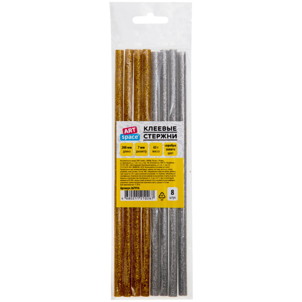 —Клеевые стержни ArtSpace, диаметр 7мм, длина 200мм, набор 8шт. (золото, серебро), 267916
